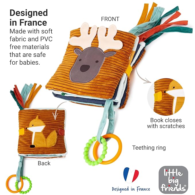 Little Big Friends 2-in-1 Soft Baby Activity Book | Crinkle Cloth Book with Mirror, Teething Ring & Textures | Sensory Toy for Infants | Attaches to Crib, Car Seat or Stroller | Forest Theme