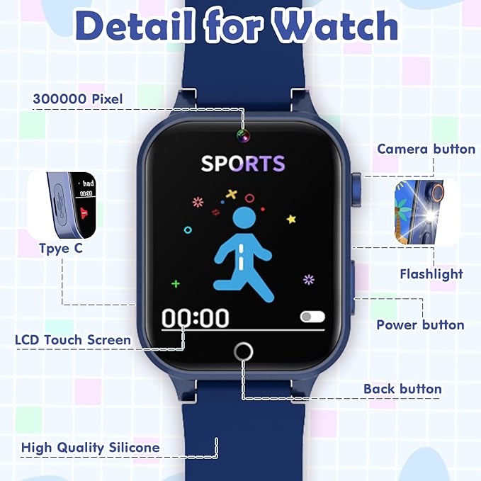 - Learning Toys for Kids: In addition to being a fun toy, Kids smart watch also has 13 educational functions and 26 different games that can help develop your child's brain and logic skills.This feature is suitable for kids aged 3-6 years old.