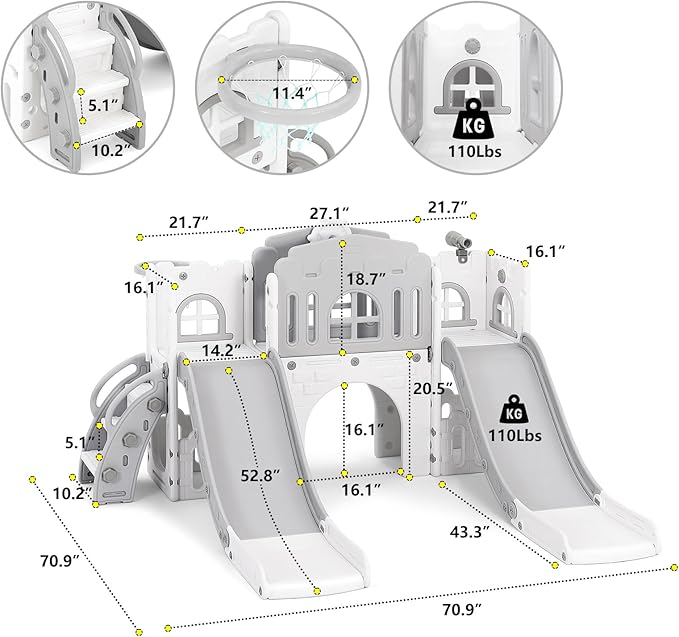 - 【9-in-1 Multifunctional Playset】JOYLDIAS 9 in 1 toddler slide set has 9 activity areas, including double 2 slides, basketball hoop, storage space and non-slip enclosed step, widened climbing ladder, crawl-through tunnel and telescope. It can exercise children's muscle strength, balance and coordination and make the reaction more agile. And add baby's fun during the play.