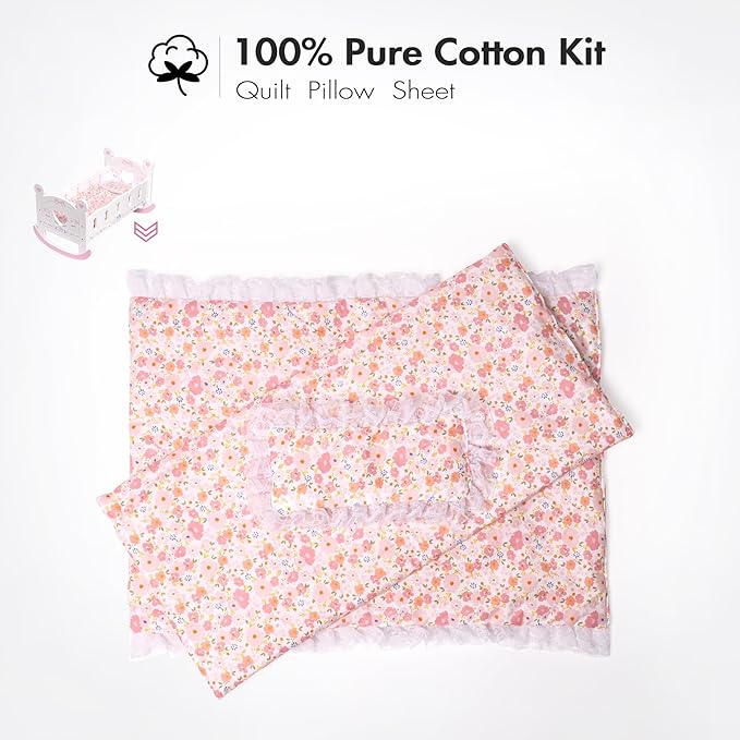 ROBOTIME Wooden Baby Doll Crib, Doll Cradle Bed for 18-24 Inch Dolls, Baby Doll Crib Set with Blanket and Pillow, Toy Doll Bed for Girls Ages 3+