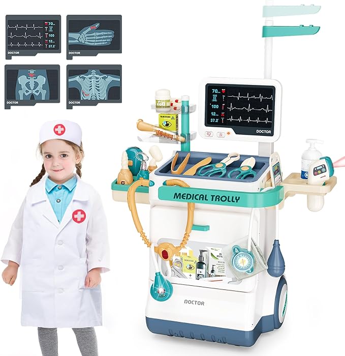 Doctor Kit for Kids 28 Accessories Pretend Medical Station Set Mobile Cart with Lights,Thermometer, Stethoscope and Doctor Costume Role Play Role Play Educational Toys for Boys & Girl Toddlers