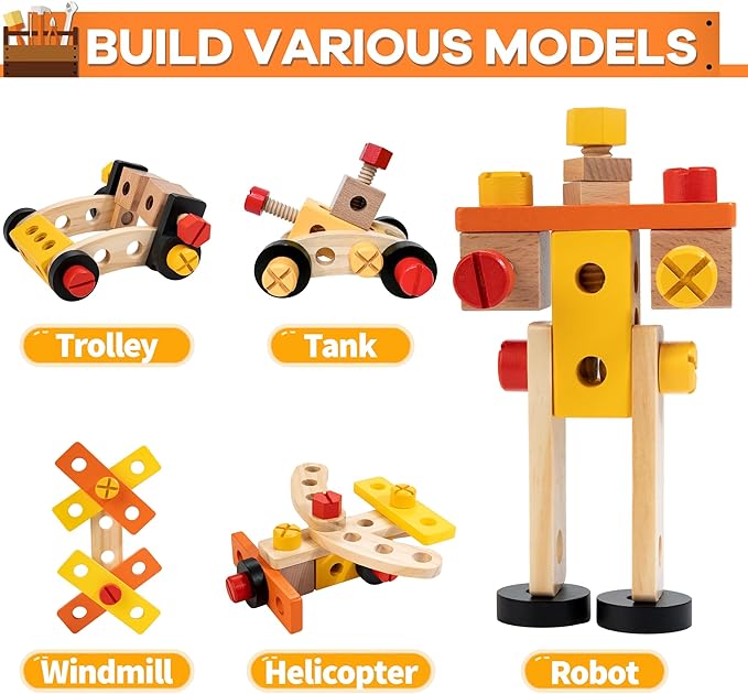 - đă54PCS RICH ACCESSORIESăThe tool box includes play saw, hammer, spanners, screwdrivers, plier, nails, screws, wheels, nuts and bolts, sheets and gears, etc., as many as 54 pieces tools and accessories for hours of pretend play screen-free fun.