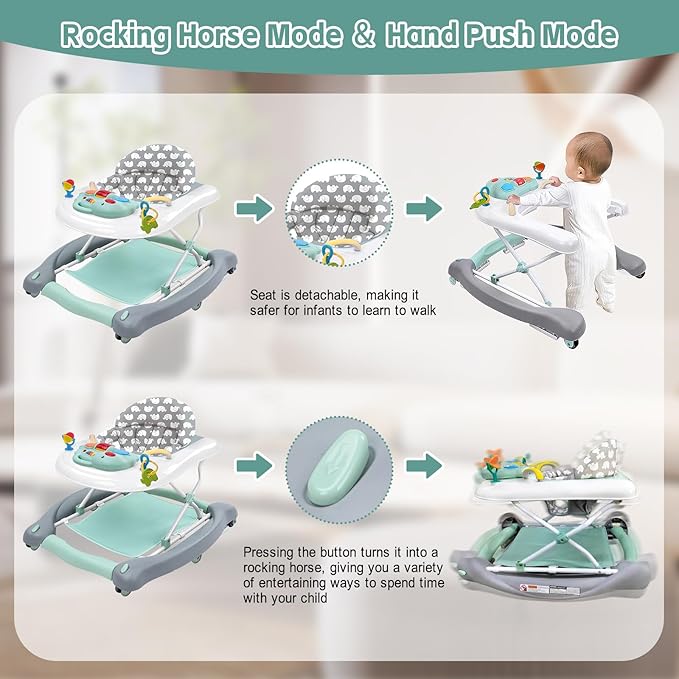 - 5-in-1 Baby Walker: Baby walker can be easily converted into 5 modes, including baby walker mode, bouncer combo mode, rocker mode, eating Table mode, hand push mode. Baby walker to meet the needs of different stages of baby's exploration, growth and baby up together, suitable for 6-18 months baby.
