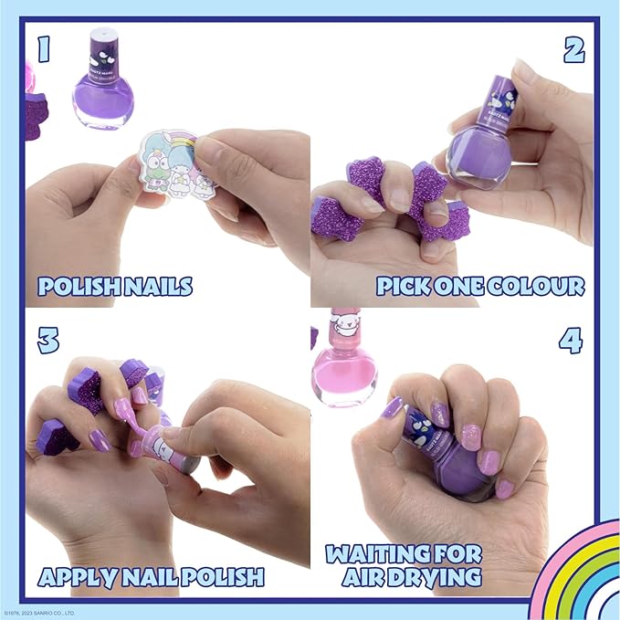 - KIT INCLUDES : Train case includes 2 purple, glittery toe spacers. 1 Lip Tube: pink, glitter (cotton candy flavor). 2 Lip Balm: Blue Shimmer (Blueberry Flavor) Rose Shimmer (Strawberry Flavor). 3 peelable nail polishes: purple, pink, and pink glitter colored (Bubble Gum Scented). 1 Nail File W/ Hello Kitty Art On Front. 3 Eye Shimmers: Rose Glitter, Blue Glitter, Gold Glitter. 3 Lip Gloss: Teal Glitter, Light Purple Glitter, Rose Glitter (Candy Flavor). See Description for more info