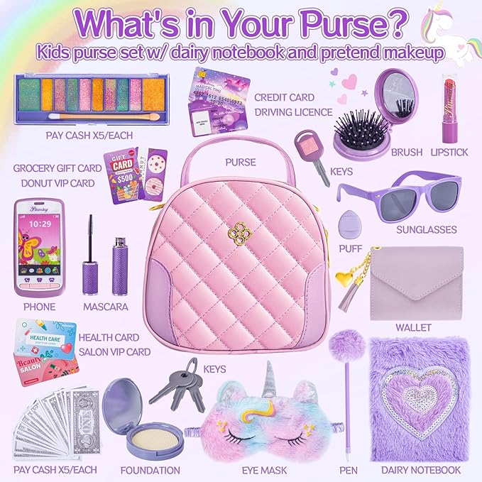 - 👑47PCS ALL INCLUSIVE PLAY PURSE SET: A complete kid purse set includes everything your little girl wish to have: 1 toy purse, 1 unicorn eye mask, 1 plush diary, 1 pom pom pen, 1 wallet holds 25pcs play money and 6 uniquely designed play cards (driving license, credit card, salon VIP card, grocery gift card, health care card, donut card), 1 sunglasses, 1 car key fob, key rings w/ 3 keys, 1 toy cellphone, 1 hairbrush, pretend Makeups (lipstick, cushion foundation, eyeshadow and mascara).