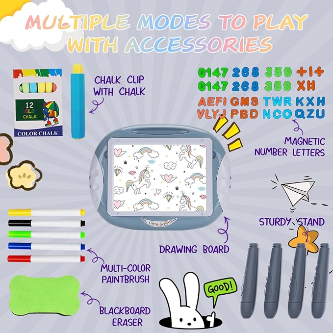- đ¨ăRich Creative Accessoriesă- Comes with 1 chalk holder, 1 blackboard eraser, 5 colored pens, 12 chalks, 25 number templates and 26 English letter templates. kids can use these accessories to study and draw, and the interior and sides of the graffiti table also provide space to store accessories, making drawing more convenient.