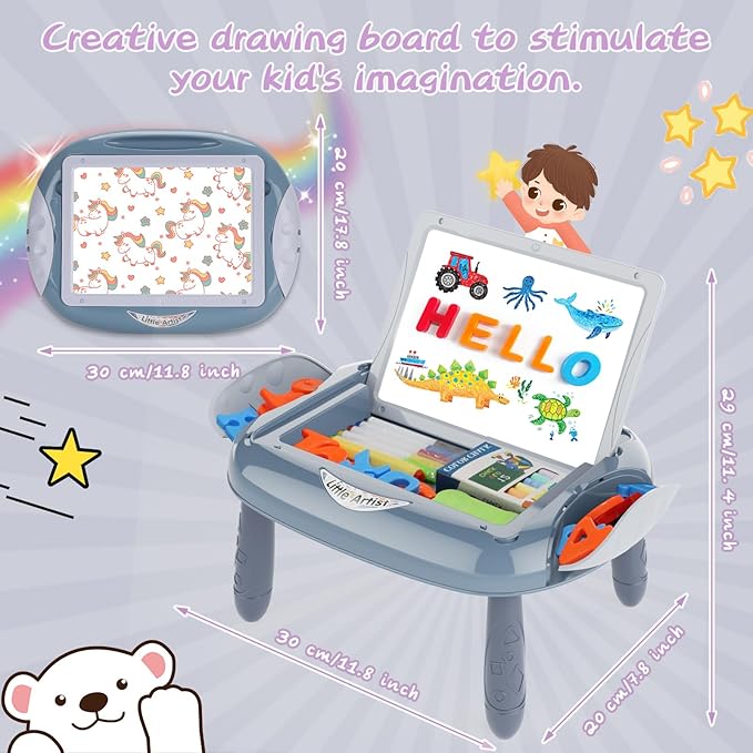 - đ¨ăMulti-Function Painting Paradiseă-This toddler learning table provides a double-sided painting experience, allowing kids to unleash their creativity. The magnetic whiteboard supports watercolor painting and math learning with magnetic letters and colour pen on the whiteboard while stimulating kid's imagination in drawing. The other side of the drawing board is a writing practice blackboard where young kids can hone their writing skills with chalk.