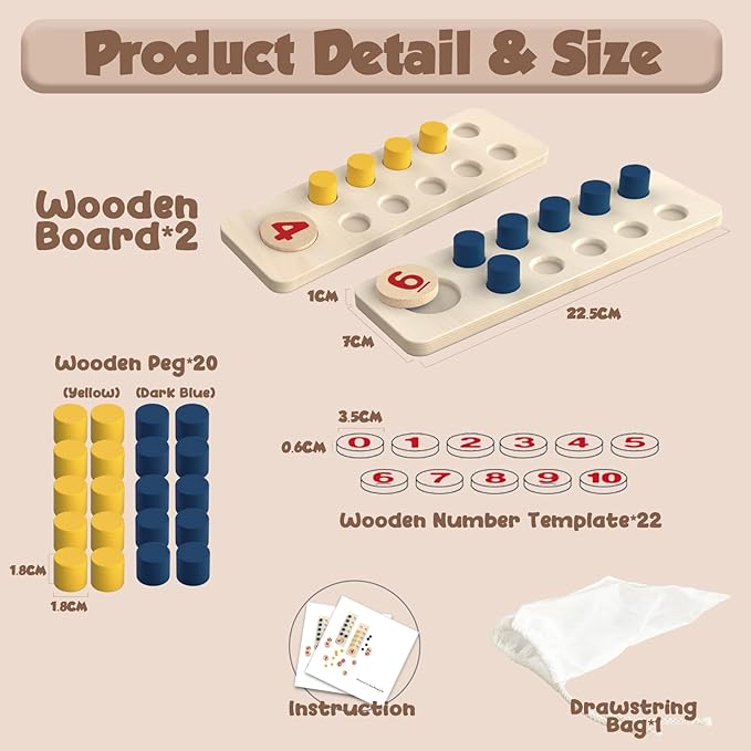- Mathematics Enlightenment Education: Our Montessori counting board contains a total of 22 numbers from 0 to 10 and 2 wooden boards to help children understand and learn the addition and subtraction of numbers from 10 to 20. Children can think and match the corresponding numbers by observing the number of wooden pegs on the game board. Promoting children’s early brain development