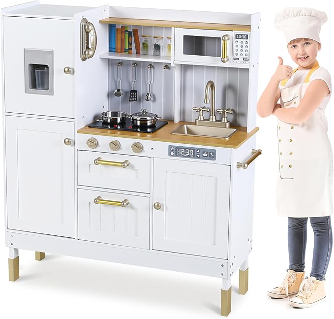 Play Kitchen, Wooden Kids Kitchen Playset, Pretend Chef Cooking Toy Set w/Realistic Lights & Sounds, Ice Maker, Telephone, Kitchen Accessories, Height Adjustable for Boys Girls Age 3+