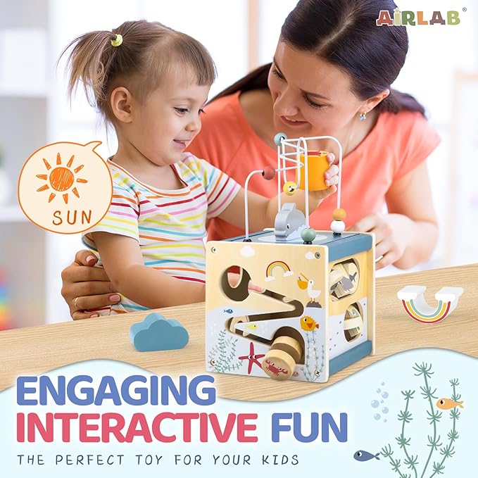- Elevate Playtime with Airlab's Premium Wooden Activity Cube! Discover quality and safety in our baby activity cube. Crafted from natural rubber wood with smooth, rounded edges and non-toxic paint, ensuring years of delightful play