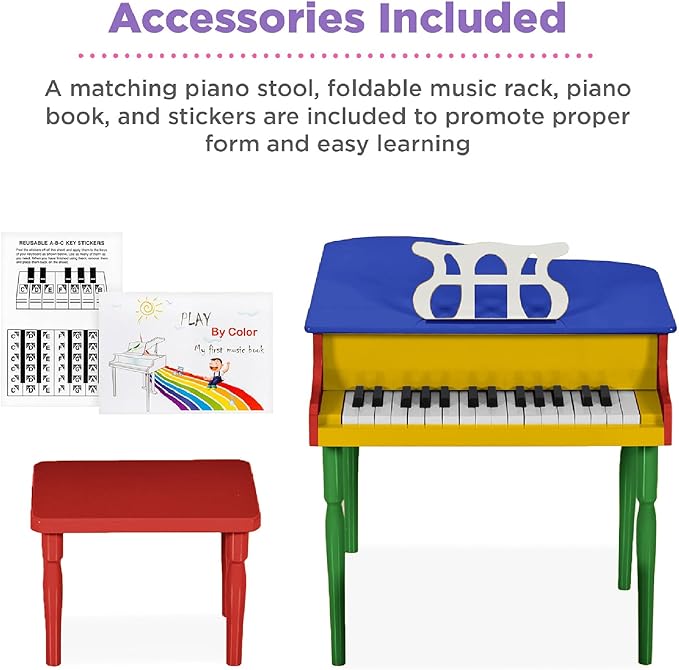 Best Choice Products Kids Classic Wooden 30-Key Mini Grand Piano Musical Instrument Toy w/ Piano Lid, Bench, Foldable Music Rack, Song Book, Note Stickers, Enamel Finish - Multi-Color
