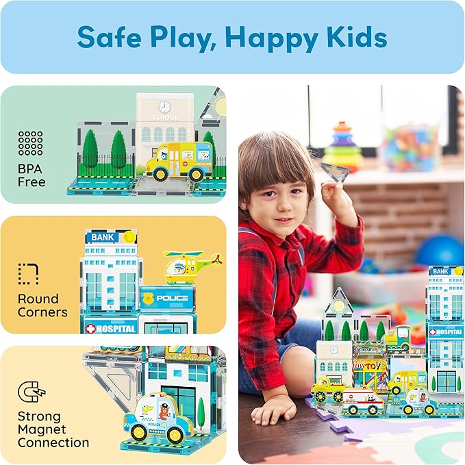 - AN INSPIRING GIFT FOR GROWING MINDS: A perfect present for ages 3 and up, this magnetic city playset blends excitement with early learning. The bright colors, detailed graphics, and character driven vehicles captivate kids while helping them explore city life and structure design. Ideal for birthdays, holidays, or milestone moments, it delivers joyful play with meaningful developmental benefits.