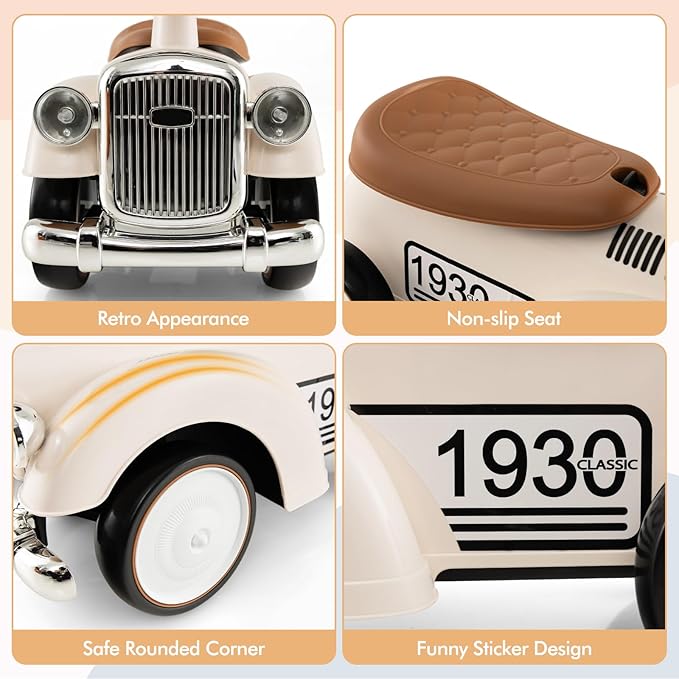 - 【Retro Appearance & Safe Design】With charming retro style and 2 funny stickers, this kids ride on car is sure to catch your child's eye. The air horn with beeping sound offers endless fun. Plus, the safe rounded corner and non-slip seat add additional safety, making the toddler riding toy a safe choice for your infants.