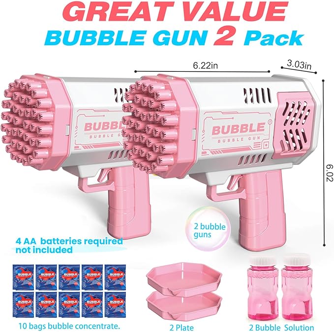 - BUBBLE MACHINE 2-PIECE SET: This bubble machine includes 2 pieces of bubble wands with extra 2 refills, and 10 bags of bubble concentrate. And 2 colors of bubble blower are provided to match any color