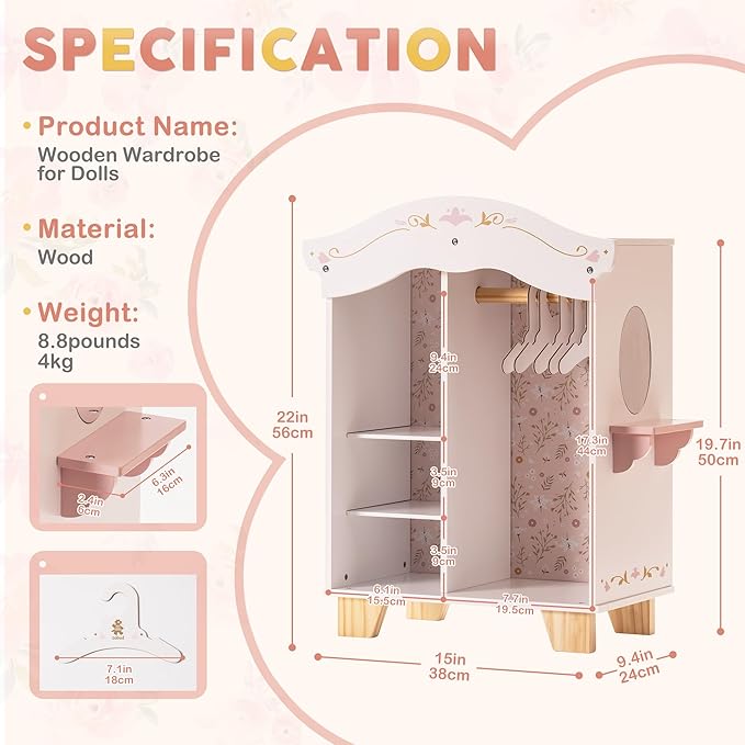 - Interactive Play: The mirrored vanity adds glamour and creates moments of imaginative play as children admire their dolls' stylish looks. Suitable for ages 3 and up, doll closet encourages creativity, organization, and role-playing in children.