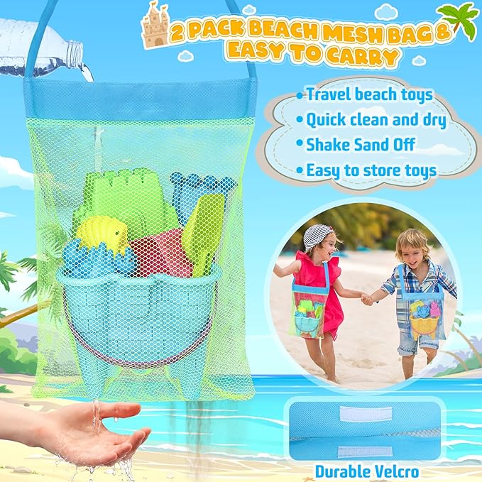 - 【 2* Beach Buckets with 2* Portable Mesh Bag】The toddlers beach toys are convenient to carry and store. The upgraded beach bucket is thick, comes with a castle model to create a castle world for kids. Very durable and portable beach toys for kids beach travel and outdoor activities. We also add 2 mesh bag to store the travel beach toys, just take very small space. The bag can filter sand and water, also dry quickly. This beach toys set is perfect for kids outdoor activities and beach trips