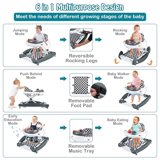 - 【6 in 1 Multipurpose Design】The HONEY JOY baby walker can realize 6 using modes, including jumping mode, rocking mode, baby walker mode, push behind mode, early education mode, baby eating mode, to meet the needs of different growing stages of the baby. Suitable Age: 7-14 months. Weight Capacity: 26.5 lbs.