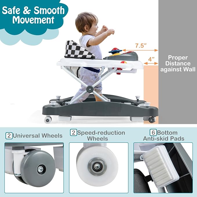 - 【Easy to Move, Fold & Store】2 universal wheels ensures safe and smooth movement. 2 speed-reduction wheels help control the pace of babies to prevent them from walking too quickly. 6 bottom anti-skid pads protect kids from falling down the stairs. The baby activity walker is also easy to fold into compact size, allowing for space-saving storage when not in use.