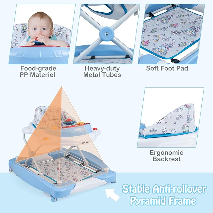 - 【3-Position Adjustable Height】Designed with 3 adjustable heights of 14.5", 15.5", and 16.5", the baby walker with wheels accompanies your little one’s growth from 7 to 14 months. By offering a suitable sitting position, the infant walker for boys girls can offer a comfortable experience. The adjustment button makes it easy to switch between these heights.