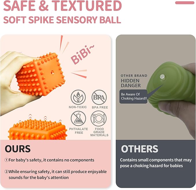 - Soft Spiky Geometric Design: Our sensory balls for baby feature a soft spiky geometric design made from gentle materials, providing a tactile sensation that stimulates sensory perception and promotes the development of your baby's senses.