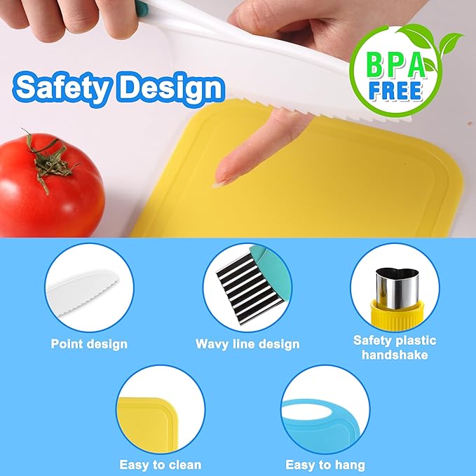 - HEALTHY AND SAFE MATERIAL:The kids knifes for real cooking is made of wood and High quality food grade polypropylene,and quality stainless steel. These knives are Non-Toxic, Free from toxins, BPA free. The kids cooking set is safe for children and is environmentally friendly too. It is safe to use, durable and not easy to break.