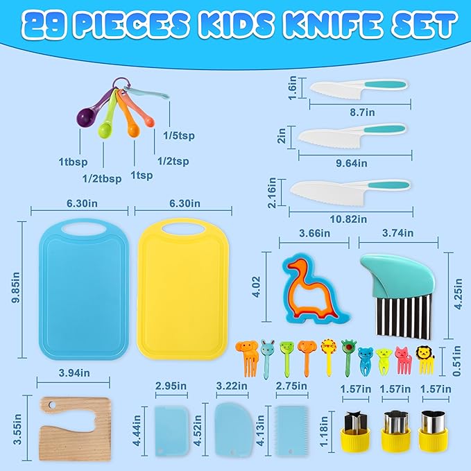 - COMPLETE KITCHEN ACCESSORIES - Total 30 pieces include: 1 wooden kids knife, 3 cooking safe knives, 1 cutting boards,1 bear sandwich shaper,1 Y-peeler, 3 sandwich cutters, 1 crinkle cutter, 5 Measuring spoons, 3 spatula