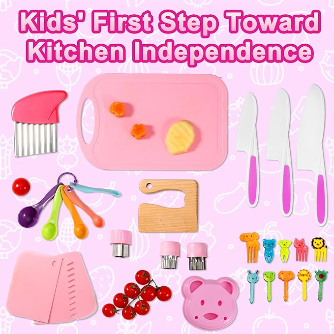 29 Pieces Kitchen Tools-Kids Cooking Sets Real-Toddler Knife Set for Real Cooking, Montessori Toys for 3+,Toddler Utensils with Safe Knives Crinkle Cutter Cutting Board