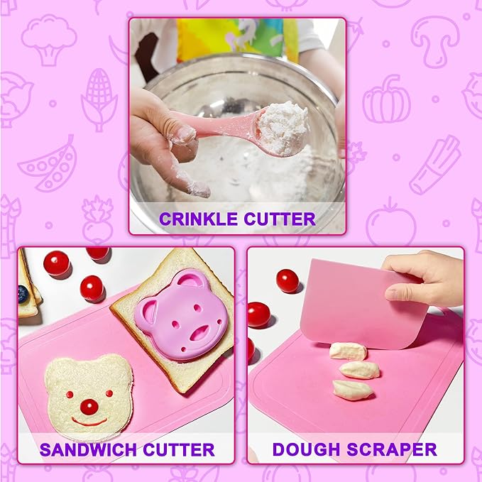 - COMPLETE KITCHEN ACCESSORIES - Total 29 pieces include: 1 wooden kids knife, 3 cooking safe knives, 1 cutting boards,1 bear sandwich shaper,1 Y-peeler, 3 sandwich cutters, 1 crinkle cutter, 5 Measuring spoons, 3 spatula, 10 fruit forks kids.
