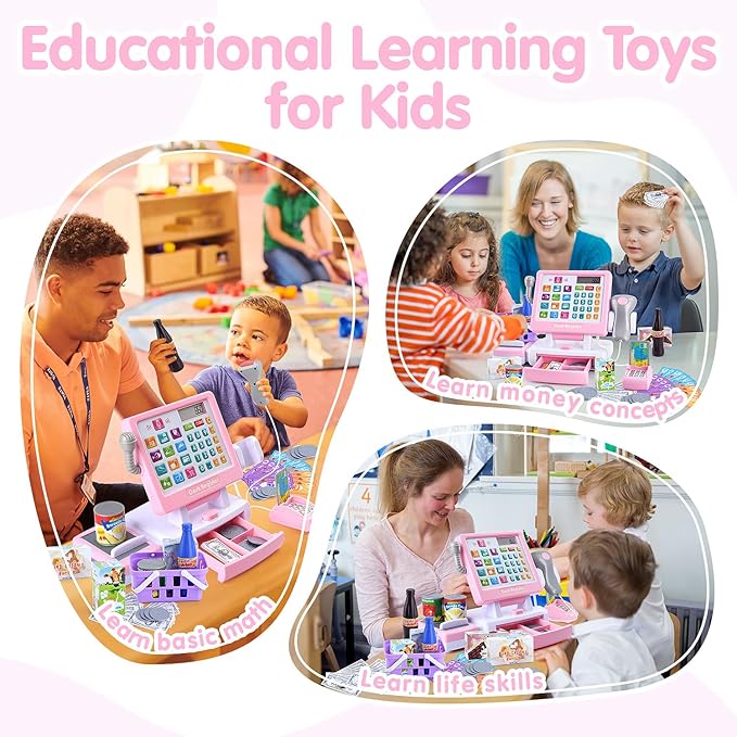 - Pink Cash Register for Kids - The screen of PLAY cash register toy is equipped with a real calculator which can be a math toys for kids 3-5, helping kids learn basic math, money counting skills and develop communication skills while playing role-playing games! This toy supermarket with register is a must-have toy cash register for kids ages 4-8 and makes a great educational toy gift. toy supermarket with register