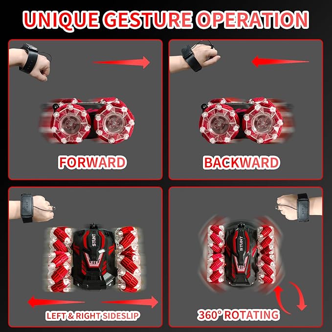 - Colorful Lighting And Cool Music: The 4WD gesture sensing rc stunt car is equipped with dazzling and stunning lighting and sound. Use these gestures to control the car by hand or through the watch, which will bring more fun to kids