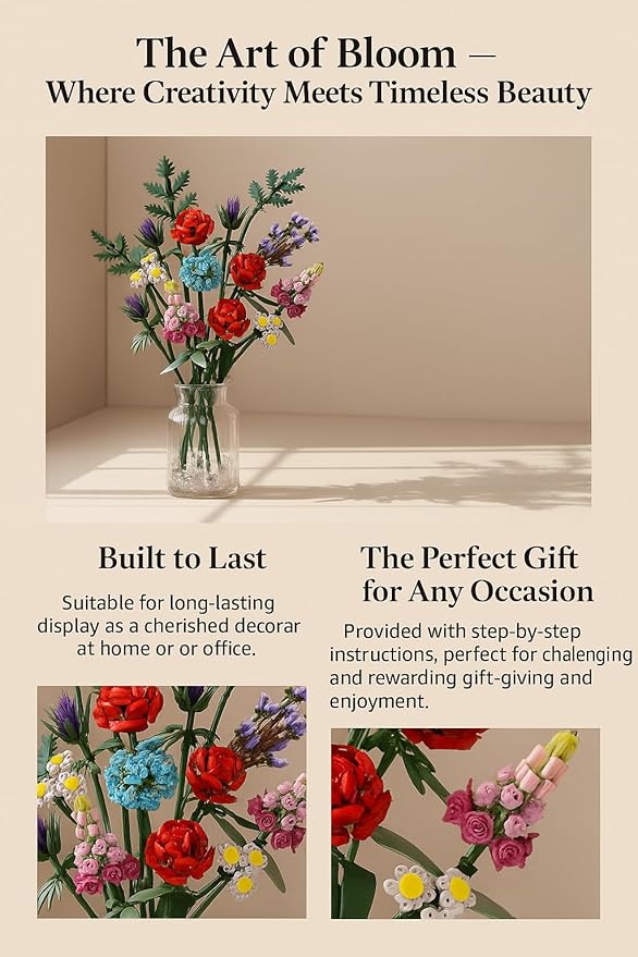 1000 Pcs Flower Bouquet Building Kit,Artificial Flower Bouquet Kit for Adults, Botanical Collection Home Decor, for Women and Girls,Anniversaries and Christmas Ideal Gift