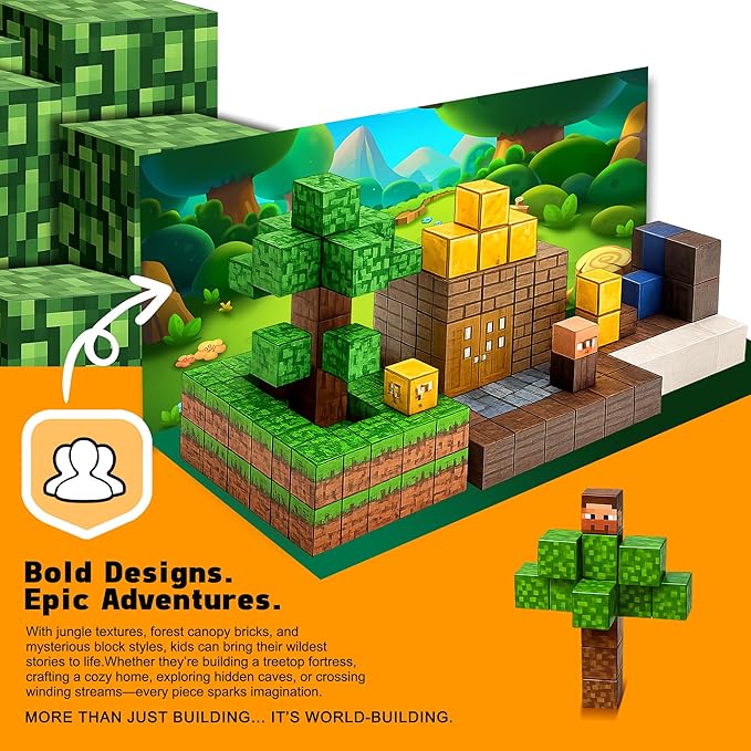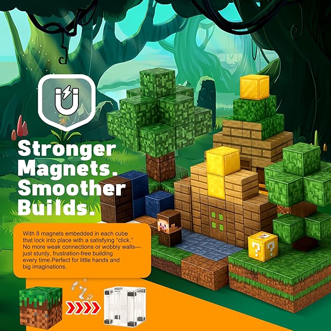 - VILLAGE THEME, 128PCS ADVENTURE— Build cabins, trees and bridges with quick-click pieces that stay put on car rides or rainy days. These kids building blocks spark storytelling with plazas, paths and tiny markets; as magnetic blocks for kids, the magnetic building cubes stack neatly and travel light for calm, screen-free fun anywhere.