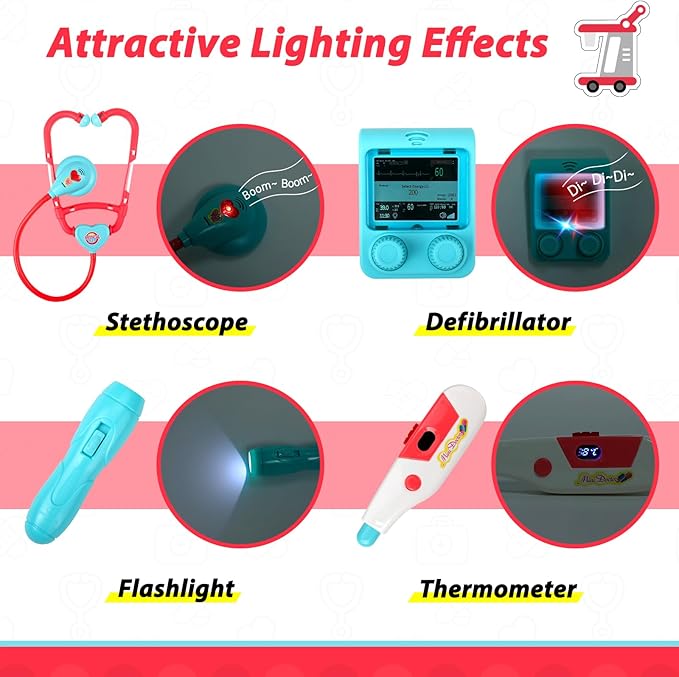 - MULTIFUNCTIONAL ACCESSORIES: Our doctor cart set includes: stethoscope, syringe, scissors, scalpel, thermometer, tray, eye glasses, flashlight, defibrillator, electrode boards, ECG display, scrubs, surgical cap, sticker x2, adhesive bandage x5, medicine spoon, tweezers, ID badge
