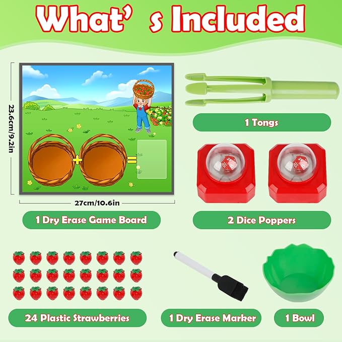 - 【What’s Included】 Math game set contains 1 dry erase game board, 1 dry erase marker, 2 dice poppers, 24 plastic strawberries, 1 bowl and 1 tongs. Our ready-to-use games provide everything students need to play math games.