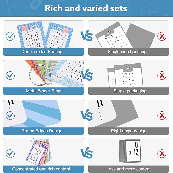 - Pocket Size: Our multiplication flash cards are made of thickened cardboard, with a laminated design that is waterproof and won't fade, size is 5.9x3.93 inches/15x10 cm, and has a rounded edge design to avoid scratching. The binder rings can not only be stored and organized, but can also be hung on a school bag, making it easy to carry and study at any time.
