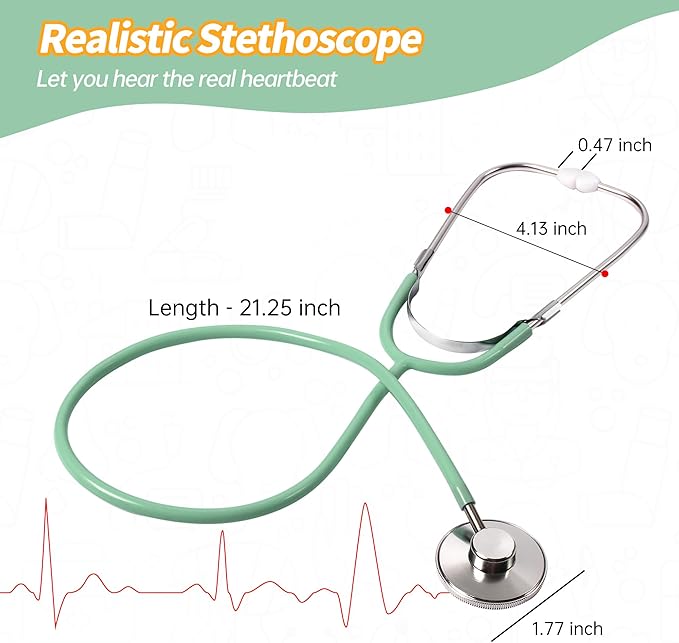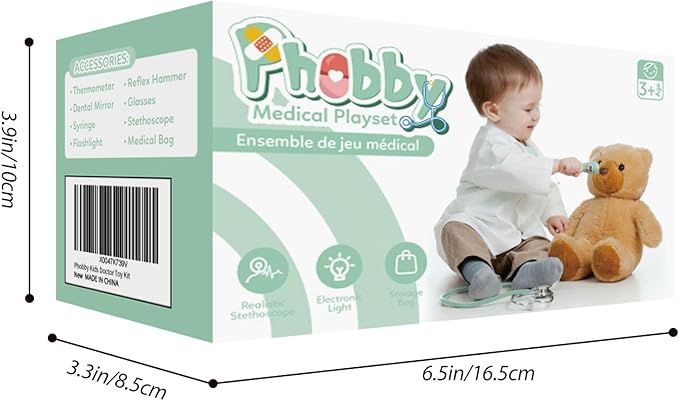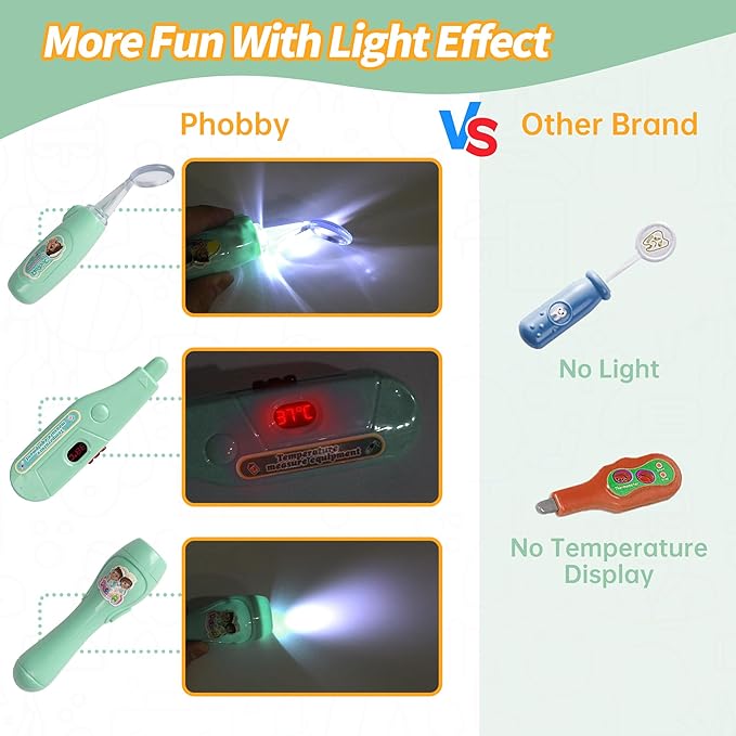 - Realistic Play Experience: Phobby upgraded stethoscope allows kids to hear the real heartbeat. The flashlight, thermometer, and dental mirror can emit light while working, and the syringe is pressable. The sound and light function and are more attractive for kids