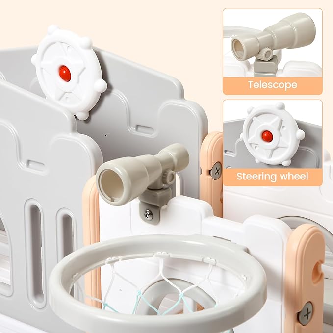 - 8 IN 1 TODDLER INDOOR PLAYGROUND - Our toddler slide playset comes with multiple fun activities, including a freestanding slide, climbing ladder, basketball hoop, crawling tunnel, telescope, and steering wheel, which supports 2-3 kids playing together.