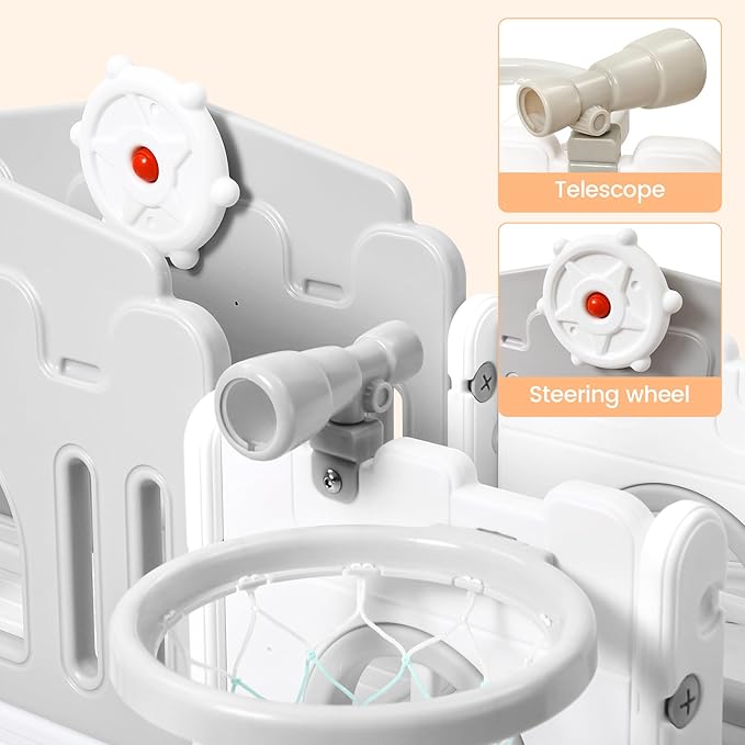 - 8 IN 1 TODDLER INDOOR PLAYGROUND - Our toddler slide playset comes with multiple fun activities, including a freestanding slide, climbing ladder, basketball hoop, crawling tunnel, telescope, and steering wheel, which supports 2-3 kids playing together.