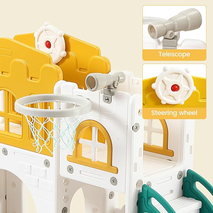 - 8 IN 1 TODDLER INDOOR PLAYGROUND - Our toddler slide playset comes with multiple fun activities, including a freestanding slide, climbing ladder, basketball hoop, crawling tunnel, telescope, and steering wheel, which supports 2-3 kids playing together.