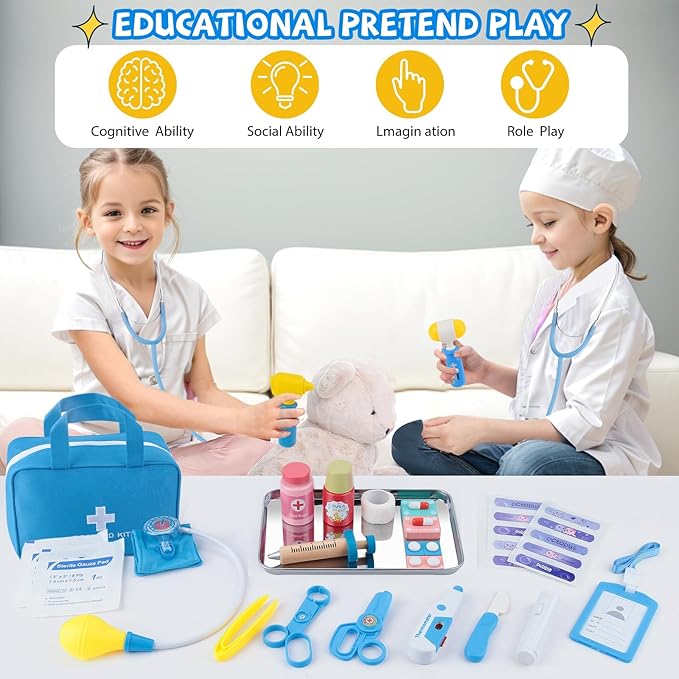 - EDUCATIONAL PRETEND PLAY: This kids doctor kit promotes learning about medical tools and body parts, nurturing imagination, empathy, and bravery. It eases anxiety and fear of doctor visits by letting kids become doctors themselves, wearing a coat and using a functional stethoscope to examine and treat their "patients." With immersive role-playing games, children have hours of enjoyable fun.