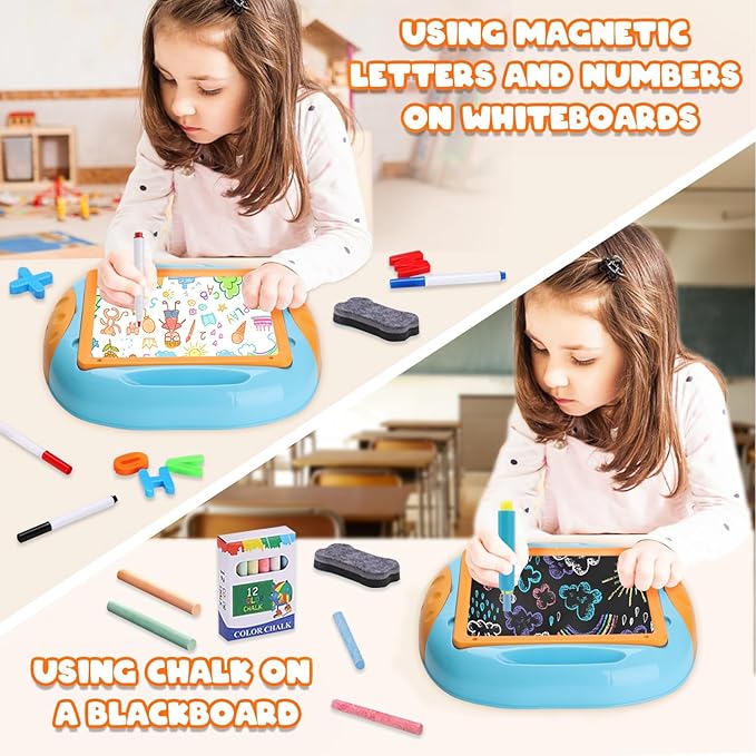 - 🎨【Double Sided Drawing Art Toy】 - Toddler learning table, provides double-sided painting experience. The magnetic whiteboard supports watercolor painting, do the math while creating vivid and colorful paintings on the whiteboard by adding magnetic letters and numbers (magnetic letters and numbers are for whiteboard use only). The other side of the board can be used for simple calligraphy, and toddlers can use the chalk to hone their writing skills.