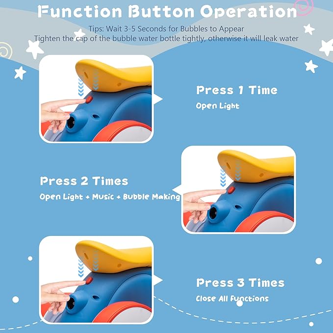 - Multi-functional Kids Balance Bike for Children to Play: The thoughtful design includes bubble devices, light effects, music functions, and whistles, adding more fun to the driving experience. Parents can ensure safe driving directions using the remote control. The use of plastic material instead of metal makes the ride-on toy lighter, more compact, and easy to store and carry. The non-slip, wear-resistant wheels are gentle on floors and allow the baby to ride indoors or outdoors.