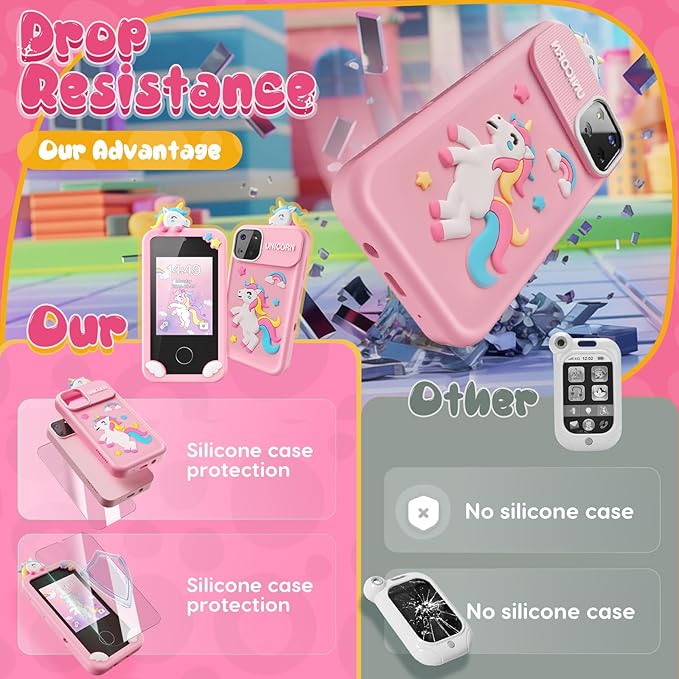 - 🦄[Drop Protection]- A unicorn toy for 4-6 year old girls with a durable silicone shell, this toy phone can withstand accidental drops. The cushioned, shock-resistant shell ensures protection and comes with a tempered film to protect the screen and extend its life. Its versatility allows your child to engage in a variety of activities, making it a durable toy.