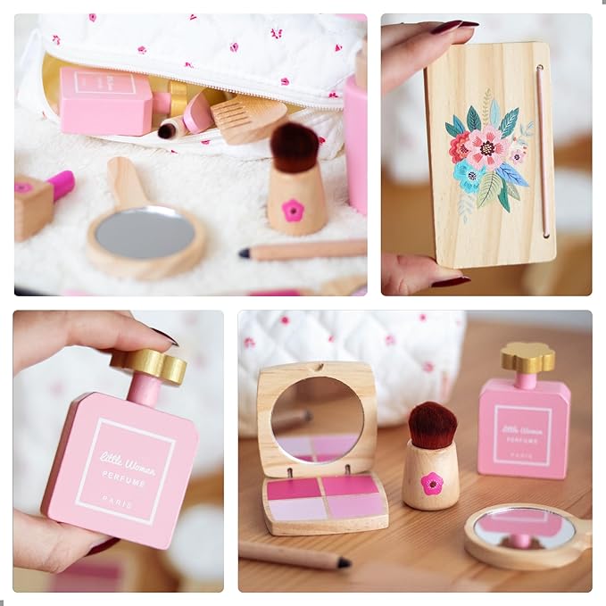 - 🎒 No Mess, Always Ready to Play – No smearing, no waste! Realistic-looking wooden pieces twist, open, and click just like real cosmetics. All fake makeup accessories store neatly in the zippered cosmetic bag – perfect for travel or play on the go.