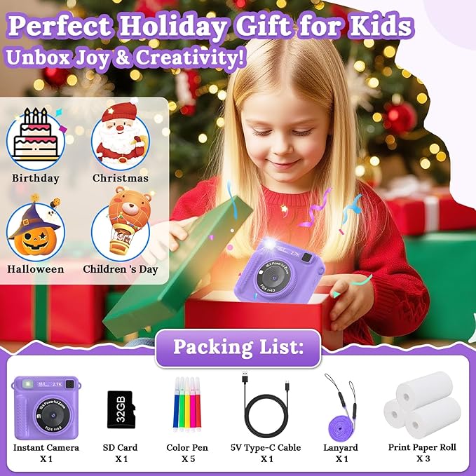 - Instant Print & Creative Fun: Our kids camera instant print quickly produces black-and-white photos while saving vibrant color images on the 32GB SD card. No bulky cartridges, ink, or toner are needed. Kids can print and decorate up to 240 photos with the included 3 rolls of paper, sparking creativity and imagination. This fun kids print camera is perfect for boys and girls who love art, encouraging artistic exploration while making memories.