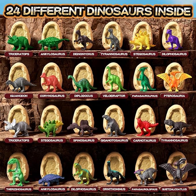 - 【Kit Includes】24 Dinosaur Eggs (with a unique toy dinosaur in each), 24 Chisel/Brushes, 24 full-colored beautiful learning cards(one for each dinosaur),1 magnifying glass,1 newspaper.Great set for individual play or as a group activity. It fascinates children as soon as they pull it out of the box and is a best STEM project.