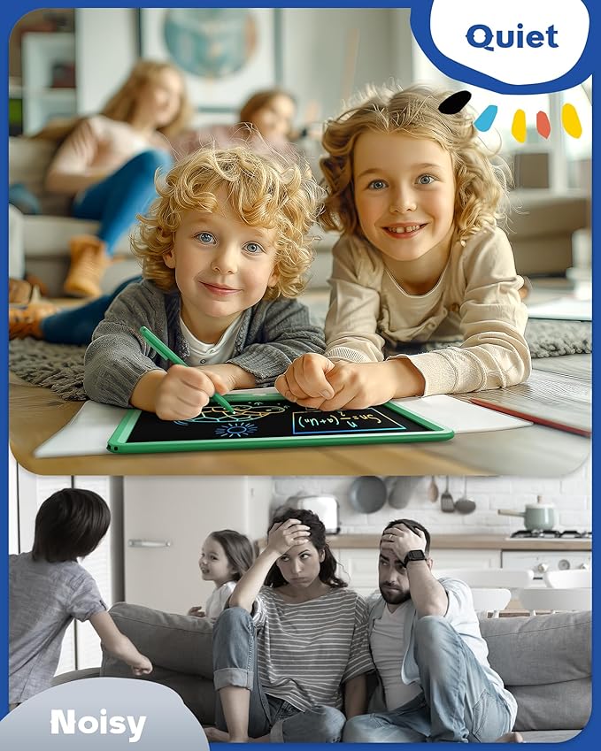 - KEEP NOISY KIDS SLIENT: Are you facing the confusion how to quiet a noisy child?LCD Writing Tablet easily allows children to quietly immerse themselves in the rainbow world. The doodle board also can be used in multiple places: airplane, car, restaurant, sofa, etc. The perfect travel essentials for kids!!!
