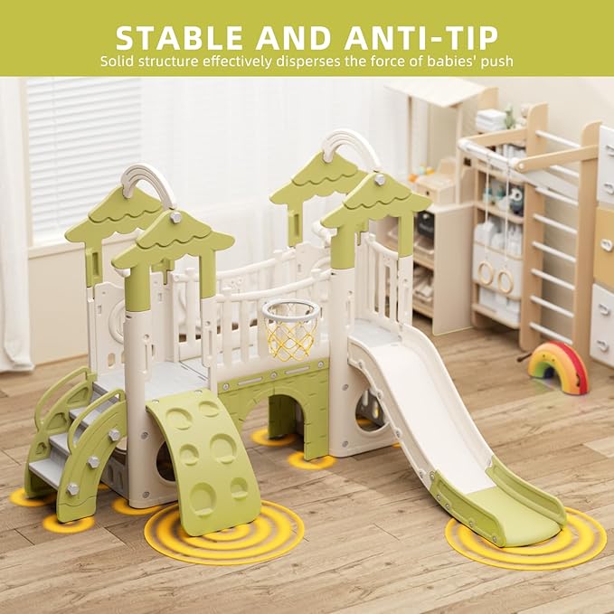 - All-in-One Playset: The 9-in-1 slide toy offers a variety of play experiences, including a gentle slide, a climbing wall with easy grips, and a cozy tunnel for exploration. It also features toy telescopes and a soft basketball hoop to enhance motor skills and active play.
