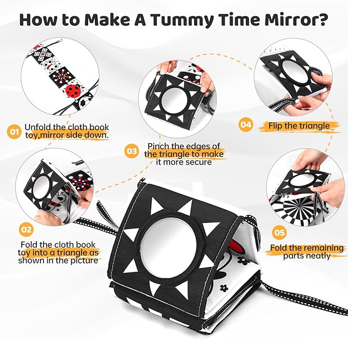 - 【High Contrast Baby Toys For Newborn】This amazing black and white baby book comes with 11 different patterns in mainly black and white colors with red accents.The black and white baby toys features 3d patterns and comes with crinkle paper to attract baby's attention.There is a ha-ha mirror to help babies recognize themselves.There is also bb call inside the book that can be pressed to make sounds.These designs turn the black and white baby toy into a high contrast baby book perfect for newborns.