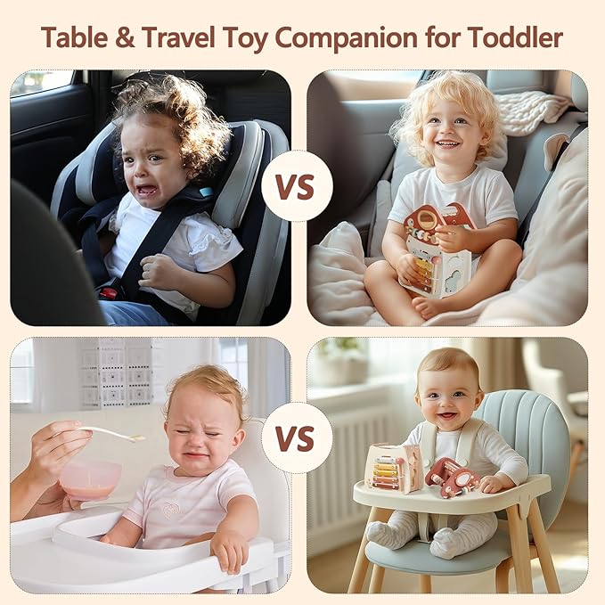 - 【8 Toys in 1】Combines 8 different activities in 1: Bead maze, baby xylophone, rain stick , shape sorter, abacus, spinning gears, sorting & stacking blocks, Keylock. The play cubes are great montessori toys for 3+ year old, keeping your toddler engaged for hours and develop kid's mind, senses and coordination